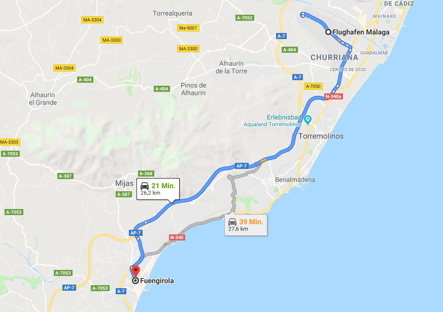 Fuengirola liegt nur 25 km vom Flughafen Málaga entfernt, weswegen sich die Anreise besonders unkompliziert gestaltet. Von Deutschland aus gibt es mehrmals pro Woche Direktverbindungen, die unter anderem von easyJet, Eurowings und Ryanair angeboten werden. Den Flughafen, der auch als Tor zur Costa del Sol bezeichnet wird, erreichen Sie dabei in rund 3 Stunden Flugzeit. Für den anschließenden Transfer sollten Sie außerdem noch einmal 25 Minuten einplanen. Es empfiehlt sich hierfür immer, den Transfer bei dem Anbieter Shuttle Direct vorzubuchen. Dann holt dieser Sie direkt am Flughafen ab und Sie sparen sich längere Wartezeiten.