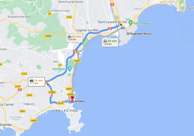 Nach Ankunft stehen ab dem Flughafen öffentliche Verkehrsmittel bis nach Antibes zur Verfügung, ein organisierter Flughafentransfer ist für die Weiterreise bis zum Ziel allerdings natürlich die angenehmere Wahl.