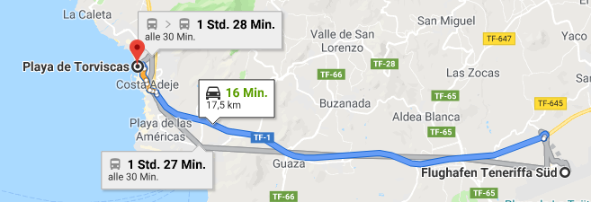 Wenn Sie den Flughafen Teneriffa Süd (TFS) anfliegen, sind Sie Ihrem Ferienort Torviscas ganz nah. Mehrere Fluggesellschaften fliegen täglich diese Destianation an mit günstigen Flugangeboten. Mit Ryanair und TUI fly landen Sie aus Deutschland je nach Abflugsort am schnellsten nach einer Flugdauer von 4 Stunden und 55 Minuten.
