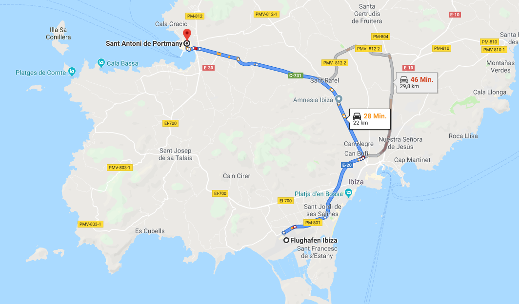 Buchen Sie einen Flug zum Flughafen Ibiza (IBZ), um schnell nach San Antonio zu gelangen. Der Flughafen wird mehrmals täglichen von Maschinen, startend von großen Flughäfen in Deutschland, Österreich und der Schweiz, angeflogen. Ein Transfer vom Flughafen Ibiza zu Ihrer Unterkunft in San Antonio dauert mit einem im Voraus gebuchten Shuttle Direct Transfer rund 25 Minuten. Allerdings werden diese 25 Minuten im Nu vorüber gehen, wenn Sie aus dem Fester schauen und die Umgebung bestaunen können.