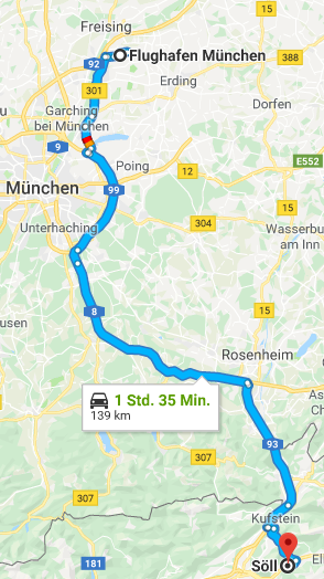 Das Örtchen Söll erreichen Sie ganz einfach über den Flughafen München (MUC). Fluggesellschaften wie Eurowings und Lufthansa fliegen aus Deutschland mit ca. 1 1/2 Flugstunden sowie aus Wien mit Austrian Airlines, SWISS und Lufthansa, täglich diese Destination an, so wird es keine Schwierigkeiten geben, noch spontan einen Flug zu finden.