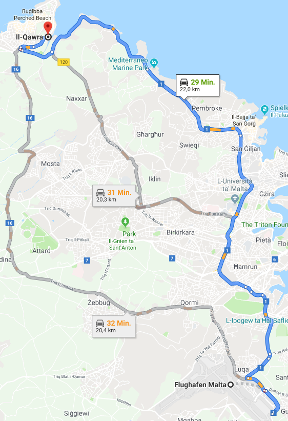 Nach Landung trennen dich zwar nur 11km von Qawra und dennoch empfehle ich dir einen privaten Transfer zu gönnen. Für mich persönlich die leichteste Art vom Flughafen bis zur Unterkunft zu gelangen- du wirst von einem Fahrer erwartet, du lehnst dich im gemütlichen Auto zurück und lässt dich bis zur Türe deiner Unterkunft chauffieren. Herrlich….