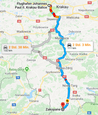 Zakopone ist nur eine kurze Autofahrt vom Flughafen Krakau entfernt, welcher mehrmals täglich von Fluggesellschaften wie Lufthansa, Austrian Airlines und Eurowings mit einer kurzen ca. 4-stündigen Flugzeit angeflogen wird. Günstige Flüge sind täglich im Angebot.