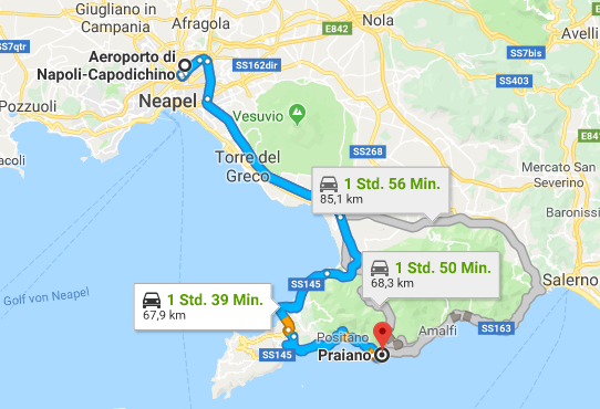 Über den Flughafen Neapel (NAP) erreichen Sie dieses verträumte Stück Erde Praiano. Die Fluggesellschaften Eurowings oder Iberia bedienen aus Deutschland diesen Flughafen sowie aus Wien erreichen Sie den Flughafen mit Austrian Airlines und easyJet. Die Flugzeit beträgt in etwa 1 1/2 Stunden und Flüge werden täglich geboten.