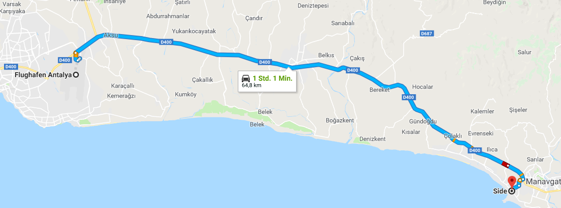 Der ist nur 45 Minuten von Side entfernt. Fluggesellschaften, wie Lufthansa, SunExpress und Turkish Airlines bieten Flüge mit einen Zwischenstopp in Istanbul an- beachten Sie dieses, da sich Ihre Reisezeit, um ein paar Stunden verlängert.
