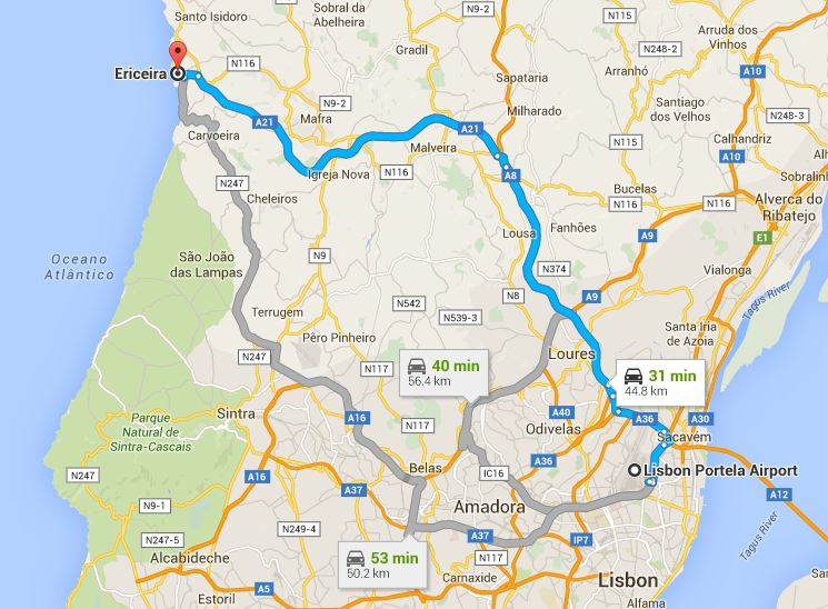Sobald Sie in Portugal landen, kommen Sie vom Flughafen geradewegs zur Tür Ihrer Unterkunf mit einem Onlinen gebuchten Lissabon-Transfer (lassen Sie die Transfergesellschaft wissen, dass Sie mit einem Brett unterwegs sind). Die schnelle, malerische Reise nach Ericeira dauert etwa 45 Minuten, so dass, wenn Sie einen Flug am Morgen aus Deutschland buchen, können Sie am Nachmittag bereits Surfen.
