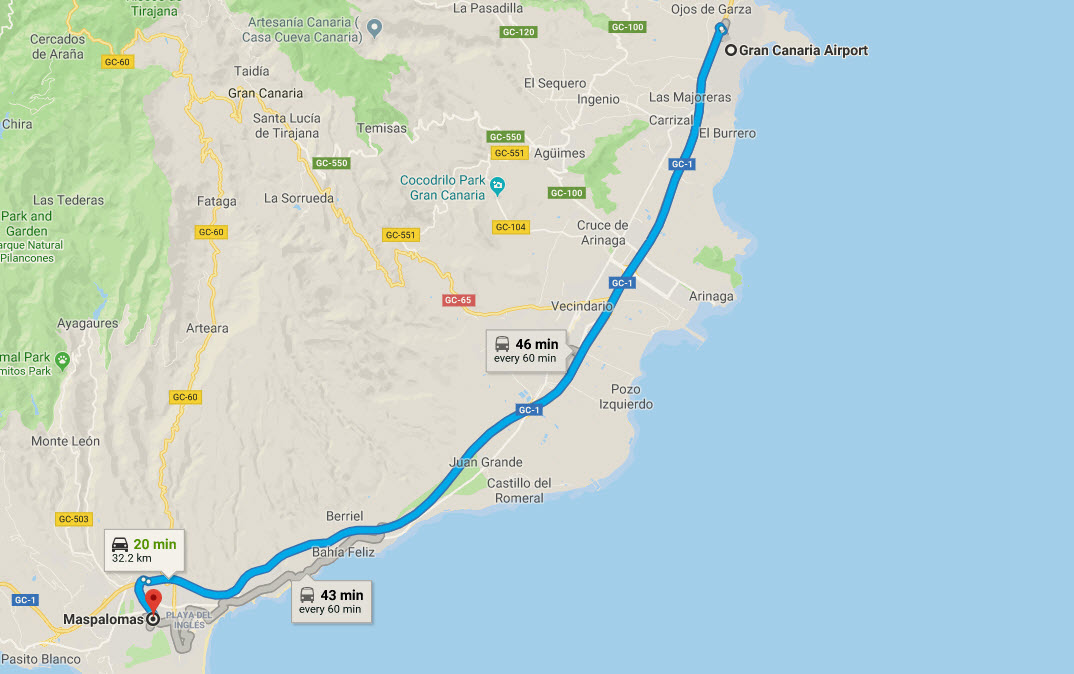 Der Flughafen Gran Canaria liegt rund 30 km von Maspalomas entfernt und garantiert eine schnelle Anreise. Da die meisten Touristen aus Großbritannien und Deutschland kommen, bieten auch entsprechend viele Fluggesellschaften Flüge von deutschen Städten (z. Bsp. Düsseldorf, Frankfurt, München) aus an. Unter anderem bedienen TUI fly, Iberia und die Billigairline Ryanair den Flughafen, wobei der Flug rund 4 Stunden dauert. Für den anschließenden Transfer empfehlen wir Shuttle Direct, das neben geteilten auch private Fahrten anbietet und Sie schnell und bequem nach Maspalomas bringt.