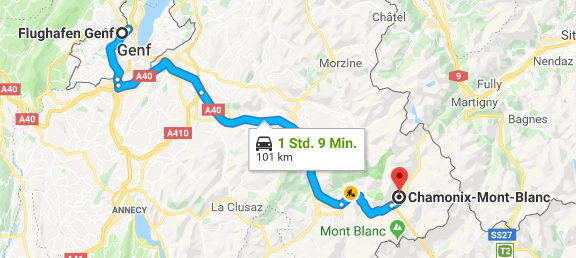 Die Distanz vom Flughafen bis zum entgütligen Zielort Chamonix beträt etwa 101 km ( 1Stunde 22 Minuten Autofahrt), so das in diesem Fall, ein Flughafen Transfer die entspannteste Wahl ist. Sie lassen Sich von einem Fahrer am Terminal abholen, Ihre Skiausrüstung wird verstaut- Sie lehen sich in einem unserer komfortablen Fahrzeuge zurück und genießen die herrliche Fahrt durch die wunderschöne Alpenlandschaft!