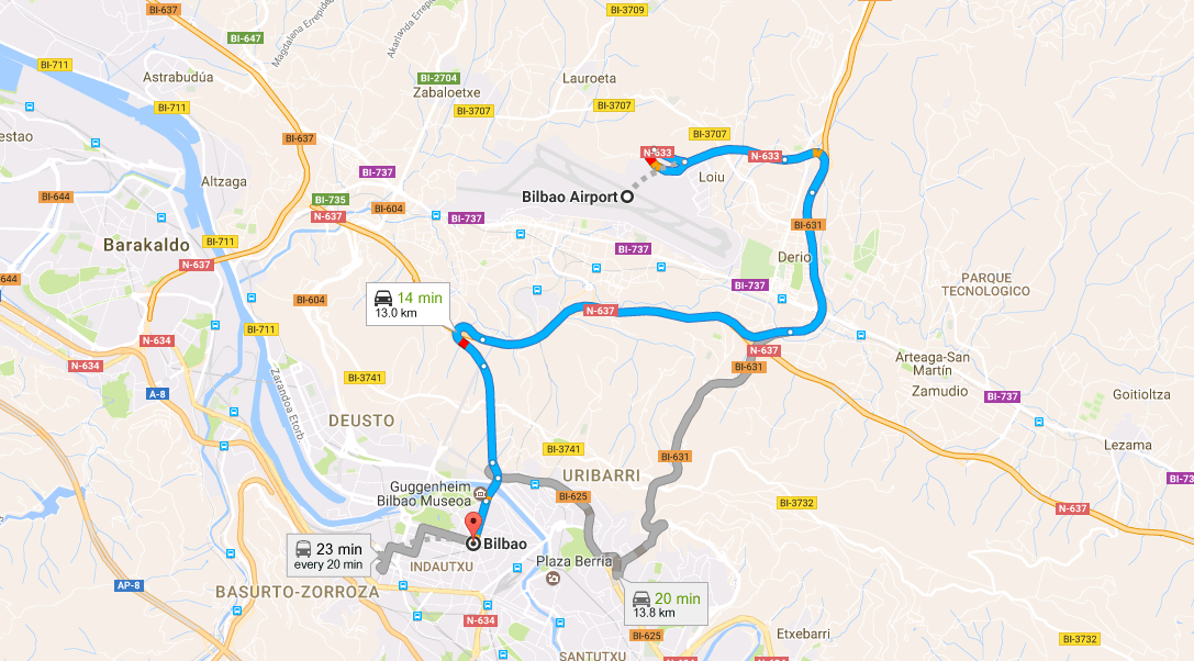 If you prefer not to wait for this shuttle you can walk from the terminal to the Neguri metro station in about about 20 minutes then take Line 1 of the Metro into the city. Once in the city you get off at Moyúa metro station then walk approximately 1km to get to the Guggenheim. If you then choose to walk along the river to the historic centre of Bilbao you can return to Getxo from the Casco Viejo metro stop on trains heading for Plentzia.