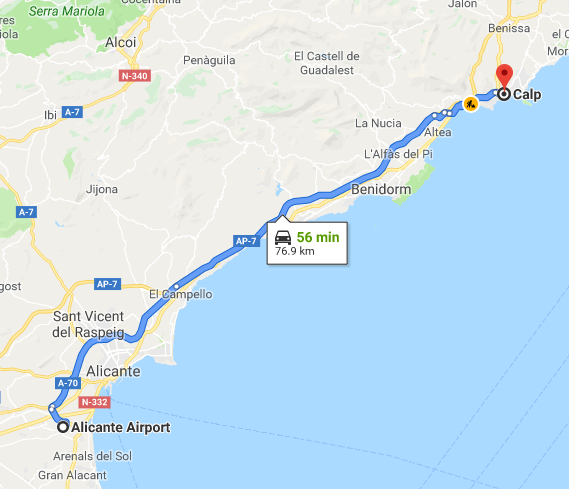 • Alicante Airport (ALC) to Calpe: 77 kilometres