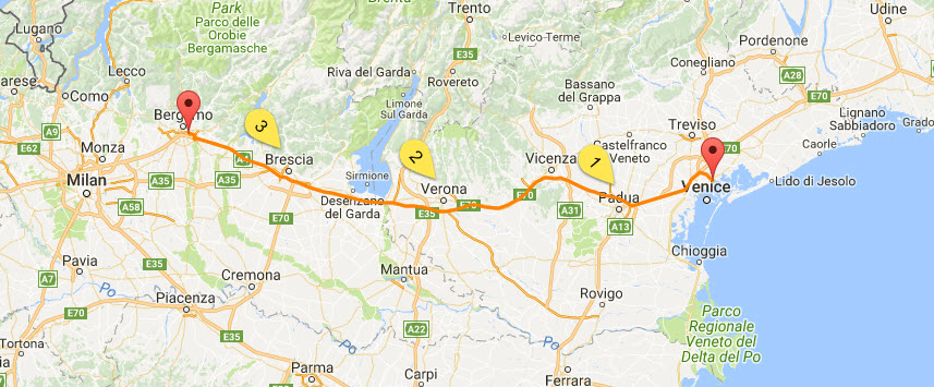NB. This route guide has been compiled as an aid to visiting the region. Your airport transfer service from Venice Marco Polo Airport to Bergamo Airport does not include stops to these destinations.