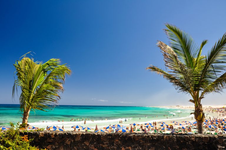 On the coast of Fuerteventura, the second largest of Spain’s Canary Islands, lies the cosmopolitan town of Corralejo. It’s a popular resort known for its natural beauty spots, from sandy dune beaches to rugged volcanic cones. Perhaps most famous are the Grandes Playas, seven miles of pristine coastline and large, shifting dunes that sweep down to the sea. They are home to exotic lizards, birds, and rabbits. Corralejo is also celebrated for its heritage as a former fishing village and
