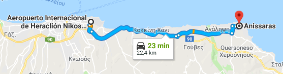 El trayecto hasta Anissaras está estimado en 22 minutos, si te desplazas de manera directa. Te aconsejamos que valores la posibilidad de contratar los servicios de una empresa de traslados. No existe una línea de autobús directa, ya que la actual te dejará a dos kilómetros de tu destino. La única opción que te queda es coger un taxi hasta allí.