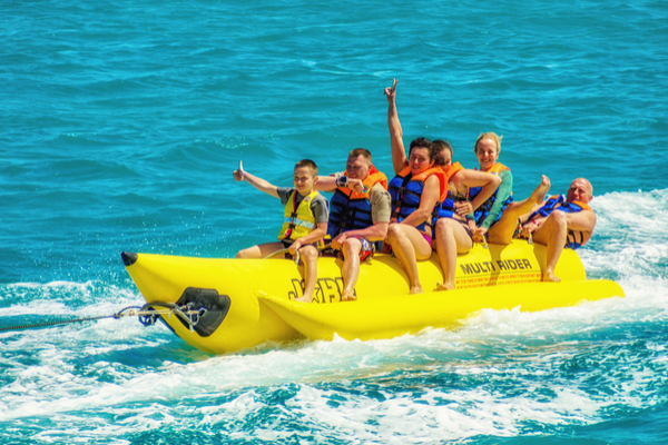 Esta actividad es muy divertida y en casa nos encanta a todos. Hacer un pequeño recorrido montados en este inflable en forma de plátano gigante mientras eres arrastrado por una lancha motora. Ponte a prueba para ver cuanto tiempo eres capaz de mantener el equilibrio mientras el conductor de la lancha hace giros bruscos para que caigas al agua.