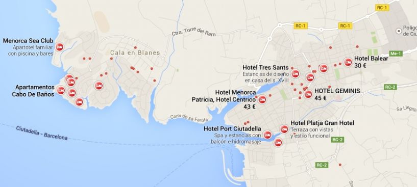 Antes de hacer un recorrido por las calles principales de Ciutadella, lo primero es alojarse en nuestro hotel o apartamento. Aquí tienes el mapa de algunos hoteles de la zona. Mi recomendación es que busques un hotel céntrico que no esté muy alejado del centro para que puedas tener todo a mano, sobre todo por la noche que es cuando hay que volver después de estar todo el día andando. No es que sean distancias enormes, pero se nota si vas a ir andando después de todo un día sin parar de hacer cosas.