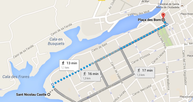 Puedes empezar tu recorrido en el Paseo Marítimo de la Ciutadella e ir dando un paseo hasta el Castillo de San Nicolás. Desde el mismo Castillo puedes pararte a descansar y tomarte algo en la Plaza del Borne, que está a unos 15 minutos andando. En esta plaza, podrás ver su obelisco representativo de la defensa de Ciudadela ante el ataque turco de 1558.