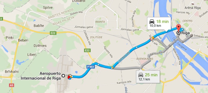 La distancia del Aeropuerto Internacional de Riga hasta el centro de Riga es de media hora, más o menos, tal y como se muestra en el siguiente mapa: