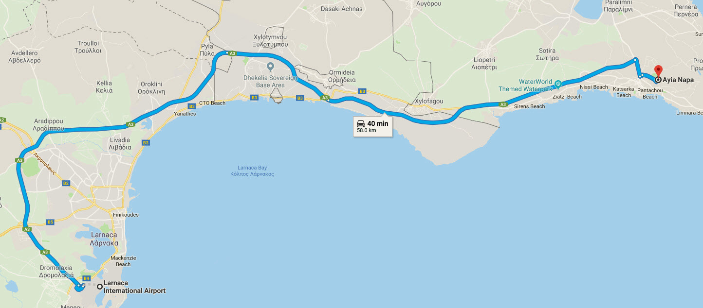 L’aéroport le plus proche d’Ayia Napa est L’Aéroport de Larnaca, qui se situe à 45km (un trajet en voiture d’environ une heure).