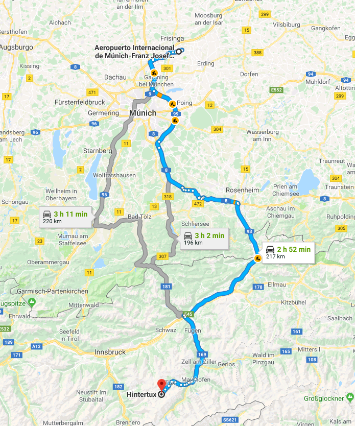 L’Aéroport Munich International, situé à 144 kilomètres de Hintertux, est l’un des aéroports les plus proches de la station hivernale (après l’Aéroport d’Innsbruck).