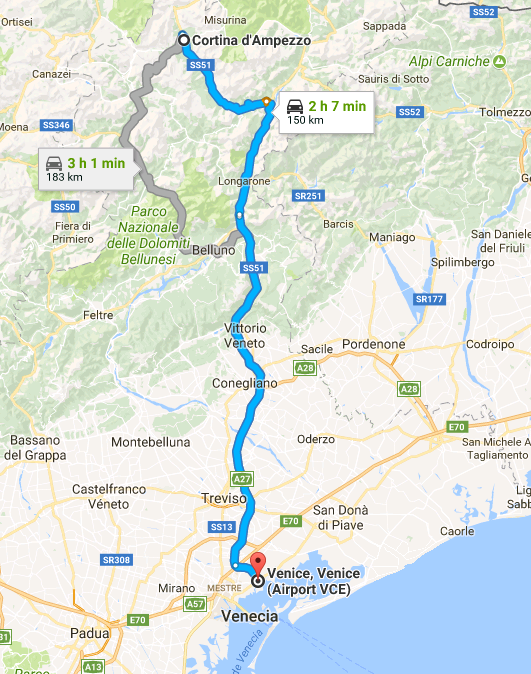 L’un des aéroports les plus proches de Cortina d’Ampezzo est L’Aéroport de Venise qui se situe à 147 kilomètres de la station (une autre option est l’Aéroport de Bolzano). Le voyage en voiture/taxi de cet aéroport jusqu’à la station dure environ 2 heures (à peu près la même durée que le trajet depuis Bolzano).