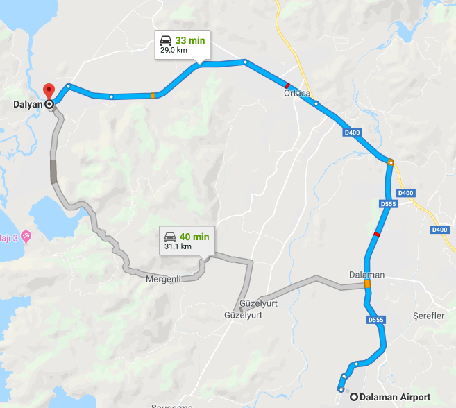 L’Aéroport de Dalaman n’a pas de liaisons ferroviaires alors tous les transports en provenance ou à l’aéroport sont routières. Le voyage par route de l’Aéroport de Dalaman vers Dalyan centre dure environ 35 minutes (une distance de 29 kilomètres).