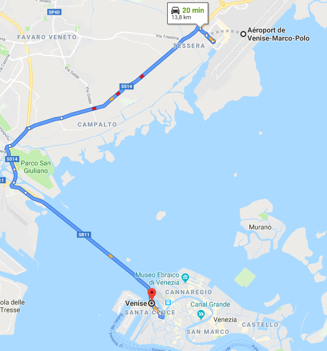 Le voyage en voiture/taxi de cet aéroport jusqu’au Piazzale Roma dure environ 15 minutes.