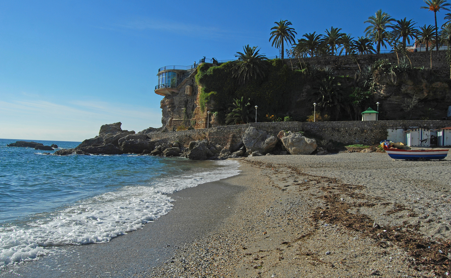 El Salon est une petite plage nichée entre des falaises et accessible seulement à pied. Située près du centre-ville et juste à côté du fameux Balcon d’Europe, cette plage à un emplacement super. Grâce à sa position centrale, les visiteurs trouveront un grand choix de restaurants à proximité de cette plage.