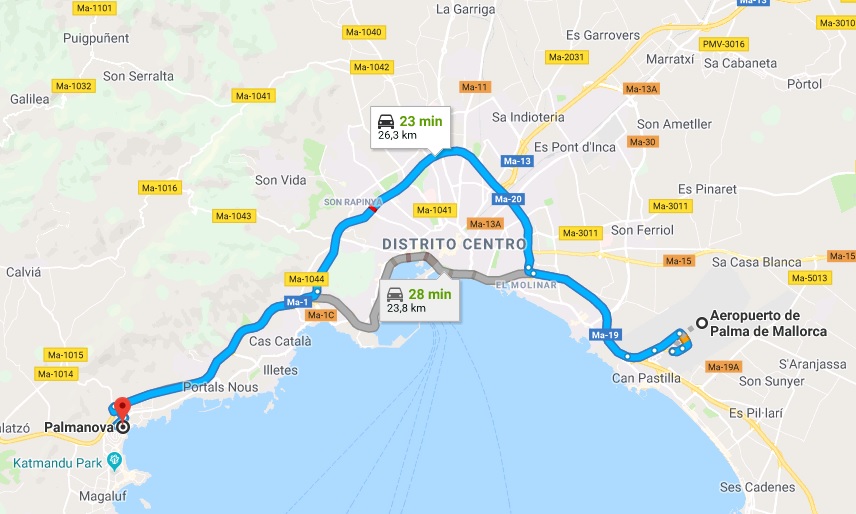 L’aéroport est à seulement 28 kilomètres de Palma Nova, donc ce n’est pas difficile de vous rendre au centre-ville en utilisant les transports en commun. Le trajet en voiture où taxi dure à peu près une demie heure, par contre prendre un bus pourra prendre plus longtemps.