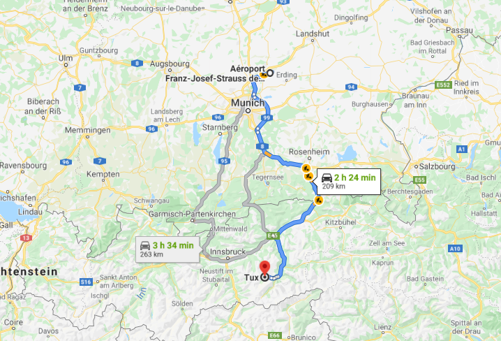 L’Aéroport Munich International, situé à 144 kilomètres de Hintertux, est l’un des aéroports les plus proches de la station hivernale (après l’Aéroport d’Innsbruck).