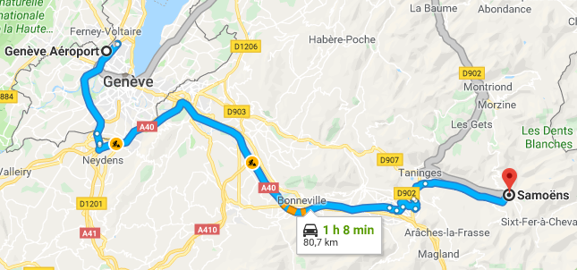 L’Aéroport International de Genève en Suisse est l’un des aéroports les plus proches de Samoëns, à environ 60 kilomètres de la station. Le voyage en voiture dure environ une heure.