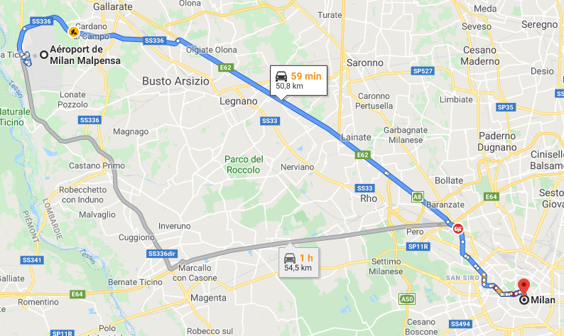 L’Aéroport Milan Malpensa se situe à environ 49 kilomètres de Milan et est le plus grand aéroport de la région métropolitaine de Milan au Nord de l’Italie. Plusieurs compagnies aériennes desservent Milan Malpensa en vol direct à partir de l’aéroport Paris-Charles-de-Gaulle ou de Paris-Beauvais (pour Ryanair), et le vol dure 1 heure 30 minutes.
