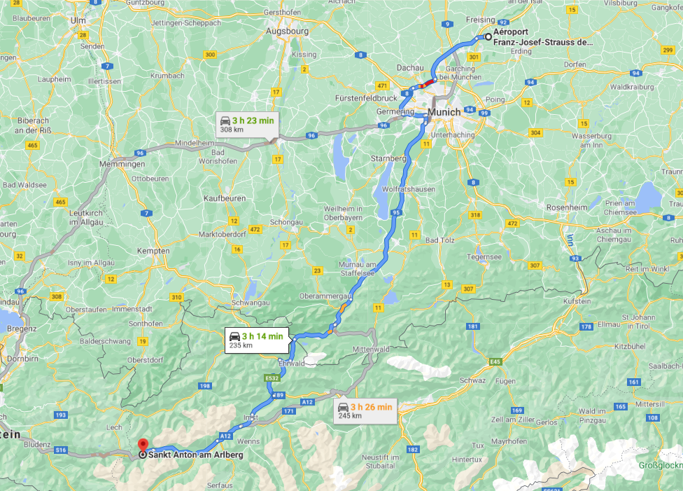 L’aéroport de Munich se situe à environ 225 kilomètres de la station de Sankt Anton am Arlberg. Ceci est un trajet de 3 heures.
