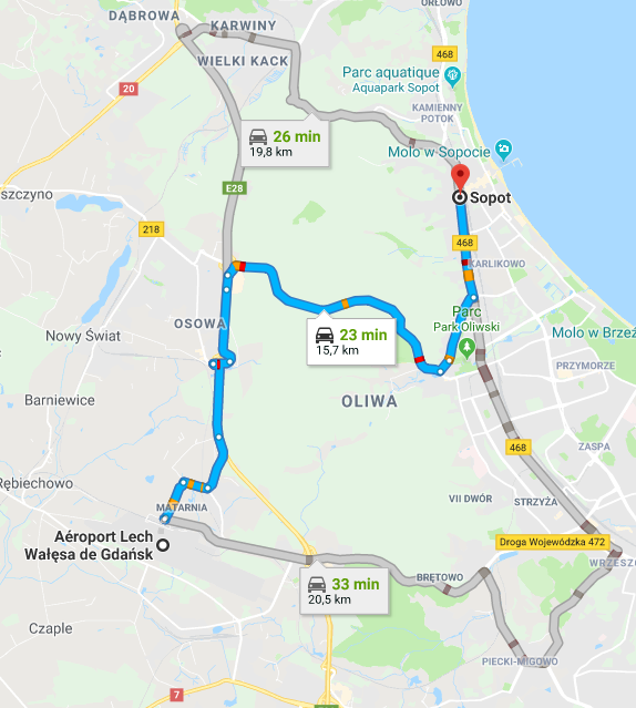 L’aéroport de situe à environ 16 kilomètres de Sopot et le trajet en voiture dire à peu près 25 minutes sans retards.