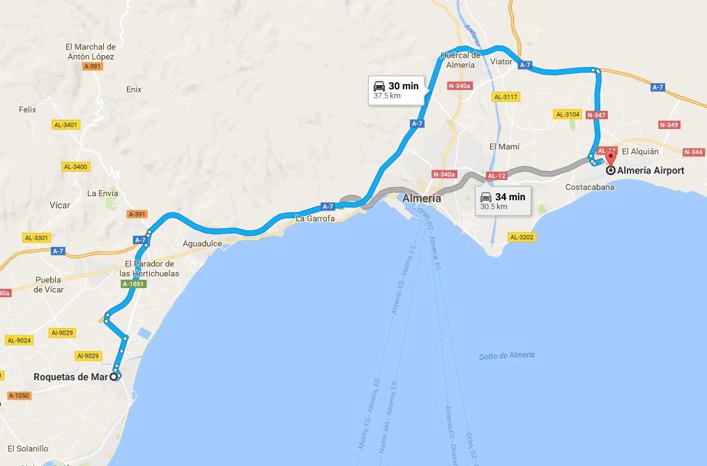 Vanuit Nederland kunt u het beste naar de luchthaven van Almería vliegen, die het dichtst bij Roquetas de Mar ligt. Als u met Transavia vliegt zult u er ongeveer 3 uur over doen om vanaf Schiphol in Almería te zijn.