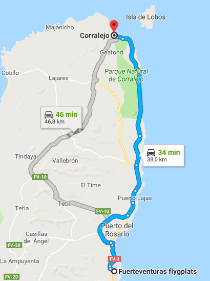 Fuerteventuras flygplats , Aeropuerto de Fuerteventura, ligger cirka 5 kilometer söder om öns största stad Puerto del Rosario. För att ta dig från flygplatsen till Corralejo är det bästa att boka en shuttle eller privattransport på Shuttle Direct.