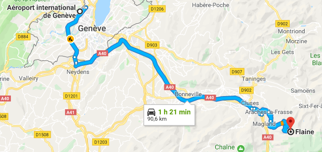 Närmaste flygplats är Genève, vars officiella namn är Cointrin, och som är unik genom att den har en fransk och en schweizisk del med passkontroller för vardera land. Den ligger sex kilometer norr om Genève och kan nås från både Frankrike och Schweiz. Flygplatsen ligger cirka 32 kilometer från Flaine och man kan åka tåg till byn Cluses som ligger nere i dalen, och sedan transferbuss, men det enklaste är att boka en shuttle hela vägen eller en privattransport via Shuttle Direct.