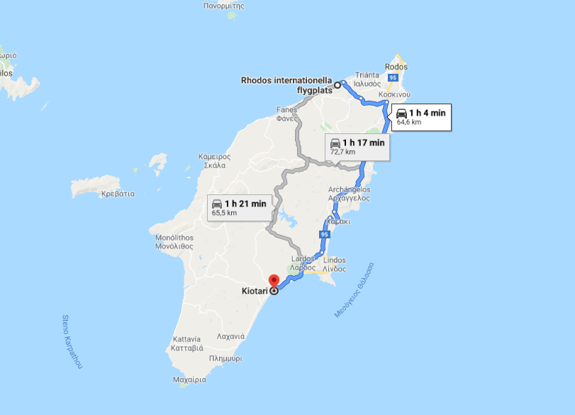 Rhodos internationella flygplats ”Diagoras” ligger 14 kilometer sydväst om staden Rhodos. För att ta dig till Kiotari kan du boka en shuttle på (link) eller en privattransport via (link).