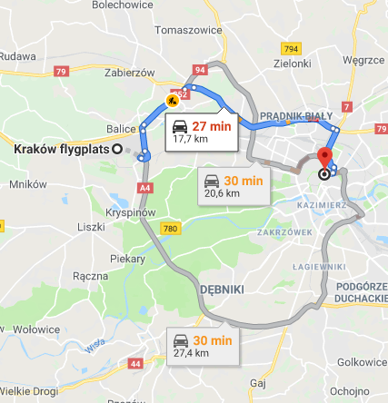 Kraków-Balices flygplats är döpt efter Johannes Paulus II och heter Międzynarodowy Port Lotniczy imienia Jana Pawła II Kraków-Balice. Du kan ta dig in till stan med tåg, buss eller taxi, men det bästa är att boka en shuttle på en privattransport via Shuttle Direct.