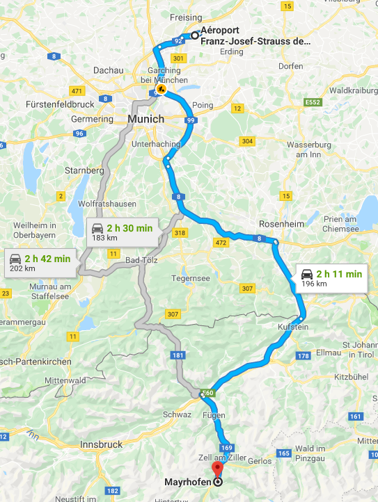 Münchens Internationella flygplats heter Franz Josef Strauss, efter politikern med samma namn, och invigdes 1992. Flygplatsen ligger 28 kilometer nordöst om München. Till Mayrhofen är det cirka 2 timmar, och det bästa sättet att ta dig dit är genom att boka en shuttle eller privattransport via Shuttle Direct.