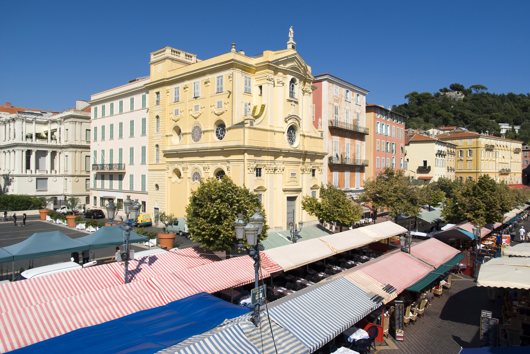 Cours Saleya – här hålls en stor blomstermarknad, Marché aux Fleurs, varje dag utom måndag då det istället blir loppmarknad.
