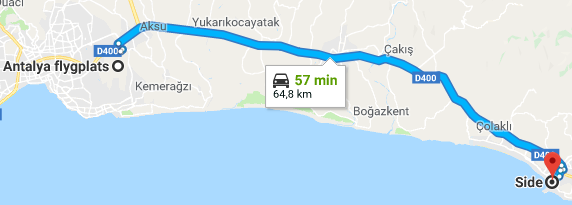 Antalya flygplats är södra Turkiets största flygplats och ligger 13 kilometer nordost om centrala Antalya. Det bästs sättet att ta sig till side är genom att boka en shuttle eller en privattransport via Shuttle Direct.