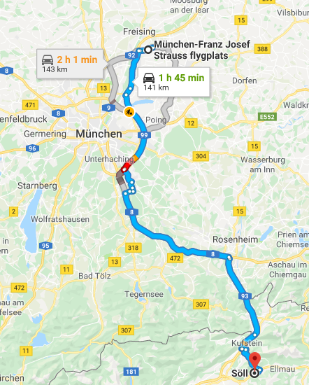 Söll ligger cirka 12 mil från Münchens flygplats Franz Josef Strauss och det bästa för att ta sig dit är genom att boka en shuttle eller en privattransport via Shuttle Direct.